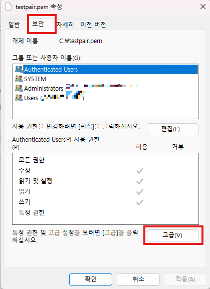 1. 키 파일을 우클릭 하여 속성 열기고 보안탭에 고급 열기