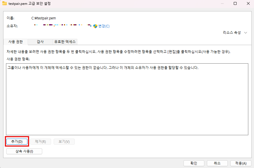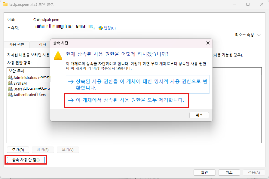 2. '상속 사용 안 함' 클릭 후 '이 개체에서 상속된 사용 권한을 모두 제거합니다.' 클릭